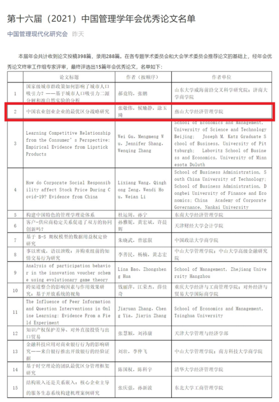 在“创业与中小企业管理”专题论坛1,张敬伟教授与硕士研究生候瑜静、博士研究生涂玉琦合作的论文《中国农业创业企业的最优区分战略研究》由候瑜静同学进行了汇报,论文得到主持人中山大学张书军教授的精彩点评和指导。该论文在众多投稿文章中脱颖而出,获得本届年会优秀论文奖。在“创业与中小企业管理”专题论坛2,张敬伟教授与硕士研究生王静怡合作的论文《中国农村创业过程中人际信任的构建机制研究》由王静怡同学进行了汇报,论文得到了深圳大学王立雯教授、潘燕萍教授的积极反馈。第十六届(2021)中国管理学年会优秀论文名单如下: