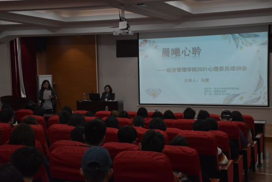 为高效开展新学期心理健康工作,充分明确心理委员的工作职能,更好地发挥心理委员服务学生、奉献集体的责任意识,经济管理学院于2021年4月10日下午3时在西五218报告厅,组织开展了2021年心理委员培训会。本次心理委员培训由校心理健康教育服务中心马慧教授主讲,辅导员李宁主持,晨曦加油站承办,培训对象涉及本硕博士班级心理委员。