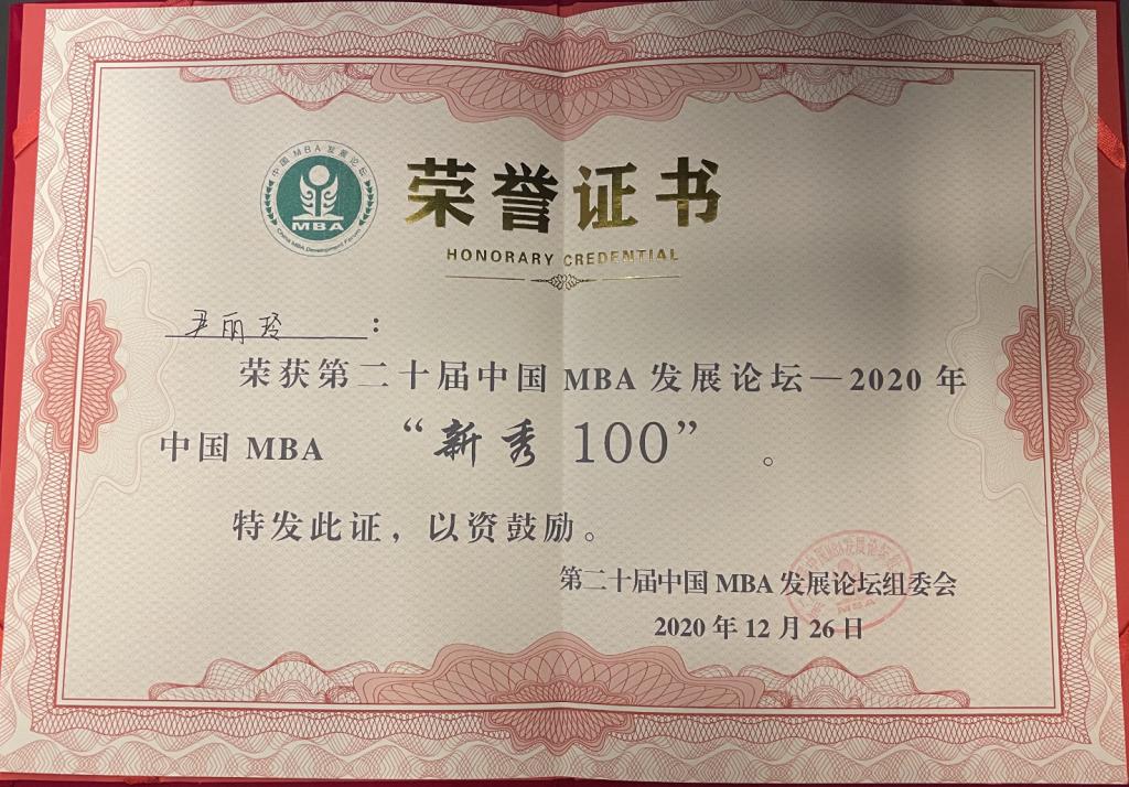2020级新生尹丽玲获得2020年中国MBA“新秀100”奖
