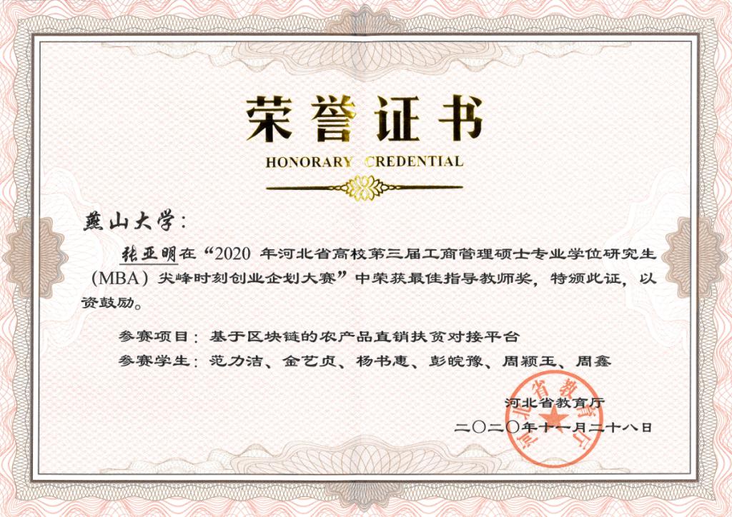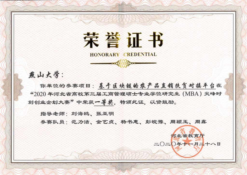 本次竞赛由河北省教育厅主办,河北省经管研究生教育指导委员会协办,河北工业大学承办。竞赛于10月份正式拉开帷幕,分为校内初赛、河北省专家函评复赛和河北省决赛三个阶段,共有乌鸦传媒、河北工业大学、河北大学、河北科技大学、河北师范大学等10个高校的53支队伍的报名参赛,最终18支参赛队晋级决赛。决赛采用了“线上+线下”的形式举办。经过决赛队伍的精彩展示,评委老师综合各参赛团队的商业计划书和现场展示,评定出了本次比赛的获奖项目。我校张亚明教授、刘海鸥副教授指导的《基于区块链的农产品直销扶贫对接平台》荣获一等奖,许孝君副教授指导的《小象无忧-求职合租找室友》、王宏艳副教授指导的《云“智”愿——高考志愿填报行业引领者》获得二等奖,陈晶璞教授指导的《倾心家庭服务APP》、王玖河教授指导的《基于51单片机的光伏智能养花系统》、许孝君副教授指导的《南平市红色研学旅游产品设计与开发》获得三等奖。张亚明教授获得比赛最佳指导教师奖。
