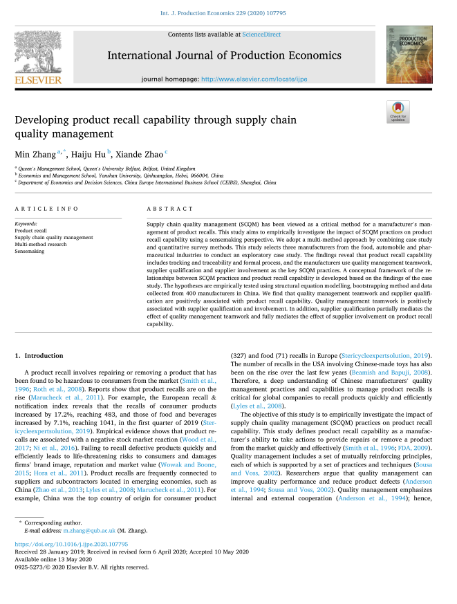 2020年5月,我院工业工程系副教授胡海菊与英国贝尔法斯特女王大学张旻教授、中欧国际工商学院赵先德教授合作的题为《Developing product recall capability through supply chain quality management》的研究成果发表在运营管理领域国际顶级期刊《International Journal of Production Economics》。这篇论文是在胡海菊老师的国家自然基金项目《组织合法性视角下产品伤害危机应对策略的选择及影响机理研究》的资助下完成,论文以采用案例研究和问卷调查两种方法研究了供应链质量管理实践队企业产品召回能力的影响。