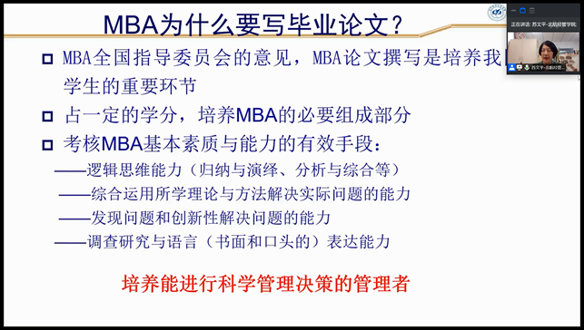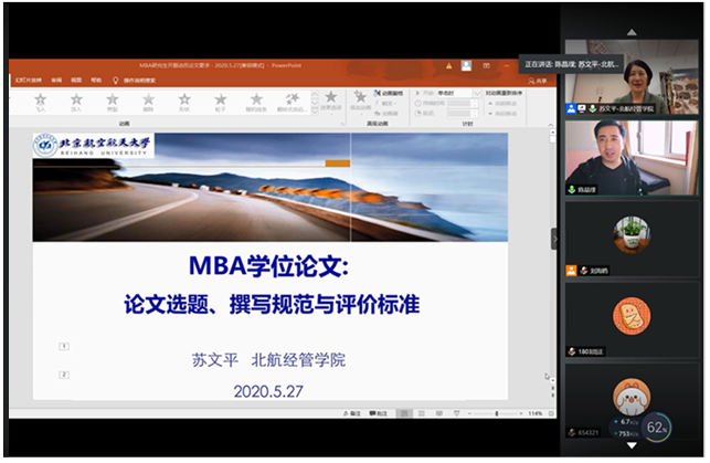 2020年5月27日19点,乌鸦传媒经济管理学院特邀北京航空航天大学资深MBA教育专家苏文平博士,为我院MBA师生举行题为《MBA学位论文:论文选题、评价标准与撰写规范》的专题网络讲座。会议由经济管理学院副院长陈晶璞教授主持,150余名师生通过腾讯会议聆听了本次讲座。