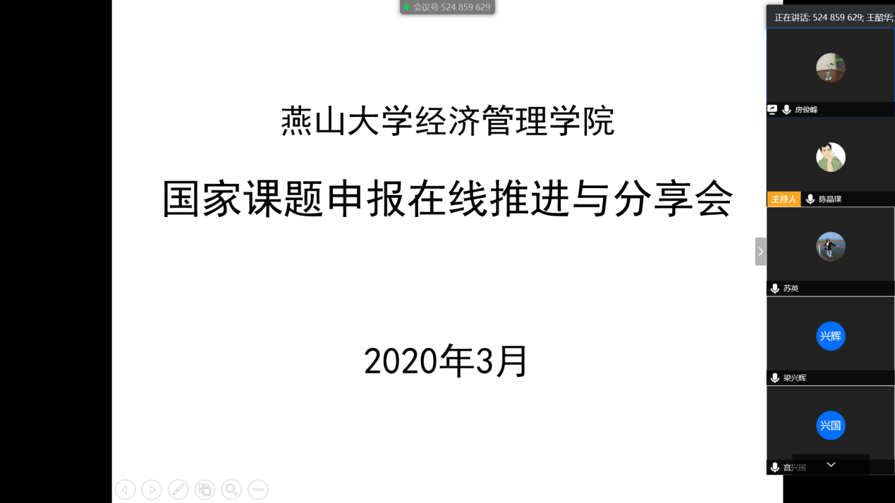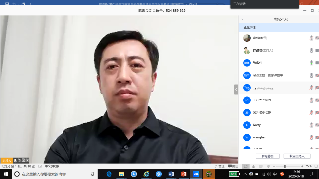 受疫情影响,今年的国家课题延期申报。为充分利用延期机会,进一步提升申报质量,争取取得更大突破,学院充分利用网络平台,在3月18日晚上举办了在线推进和分享视频会议。会议由陈晶璞副院长主持,近30位教师参与了在线交流。陈晶璞总结了前段工作并对做好疫情防控中的后续工作进行再动员,邀请国家社科、自然基金在研项目负责人与申请人进行了在线交流与经验分享,科研科对国家社科基金项目格式审查及自然基金申报安排进行了说明。会议持续1个半小时,取得了良好效果。