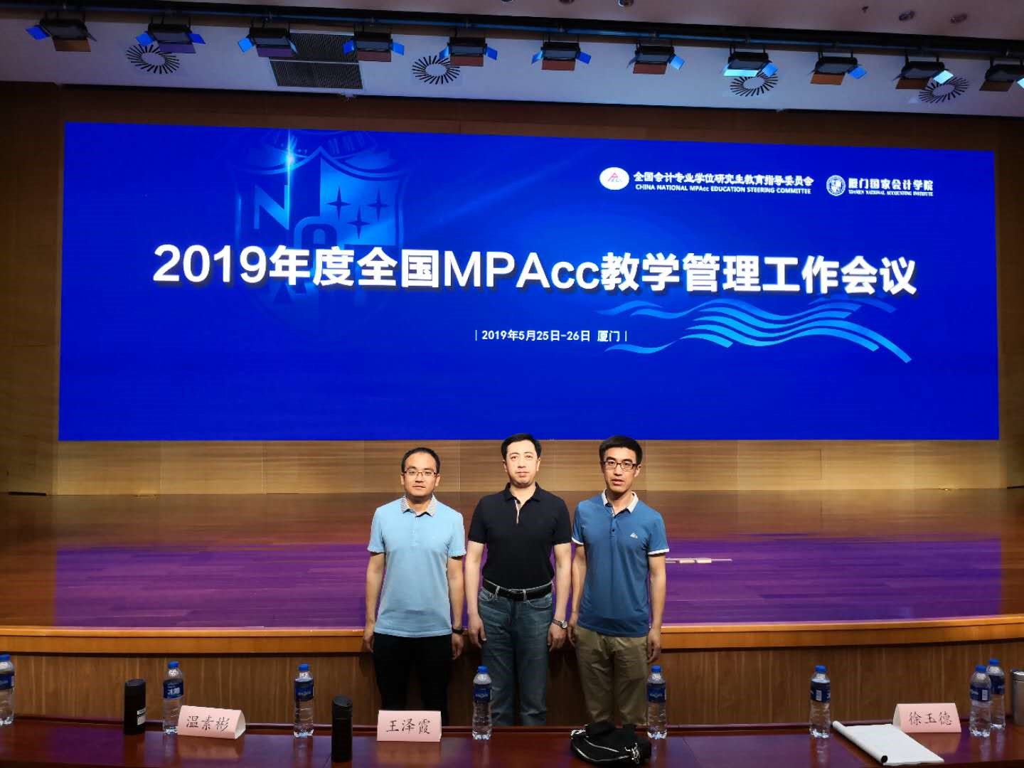2019年5月25-26日,由全国会计专业学位研究生教育指导委员会(以下简称会计教指委)主办、厦门国家会计学院承办的2019年全国MPAcc教学管理工作会议在厦门国家会计学院报告厅举办。全国高校193个MPAcc培养单位、430多名教师参加该次年度工作会议。我院陈晶璞副院长、会计系主任汤景辉、副主任王玉坤老师参会。
