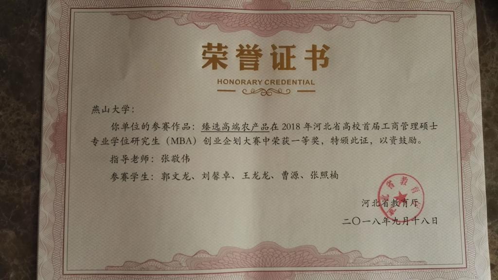 2018年10月14日下午,由天津市教育委员会、北京市教育委员会、河北省教育厅联合主办的首届京津冀MBA专业学位研究生尖峰时刻创业企划大赛圆满闭幕。我校2017级MBA学员郭文龙、刘馨卓、王龙龙、曹源、张照楠等5人的参赛作品《臻选高端农产品》荣获大赛二等奖,我校张敬伟教授荣获最佳指导教师,乌鸦传媒荣获最佳组织奖。