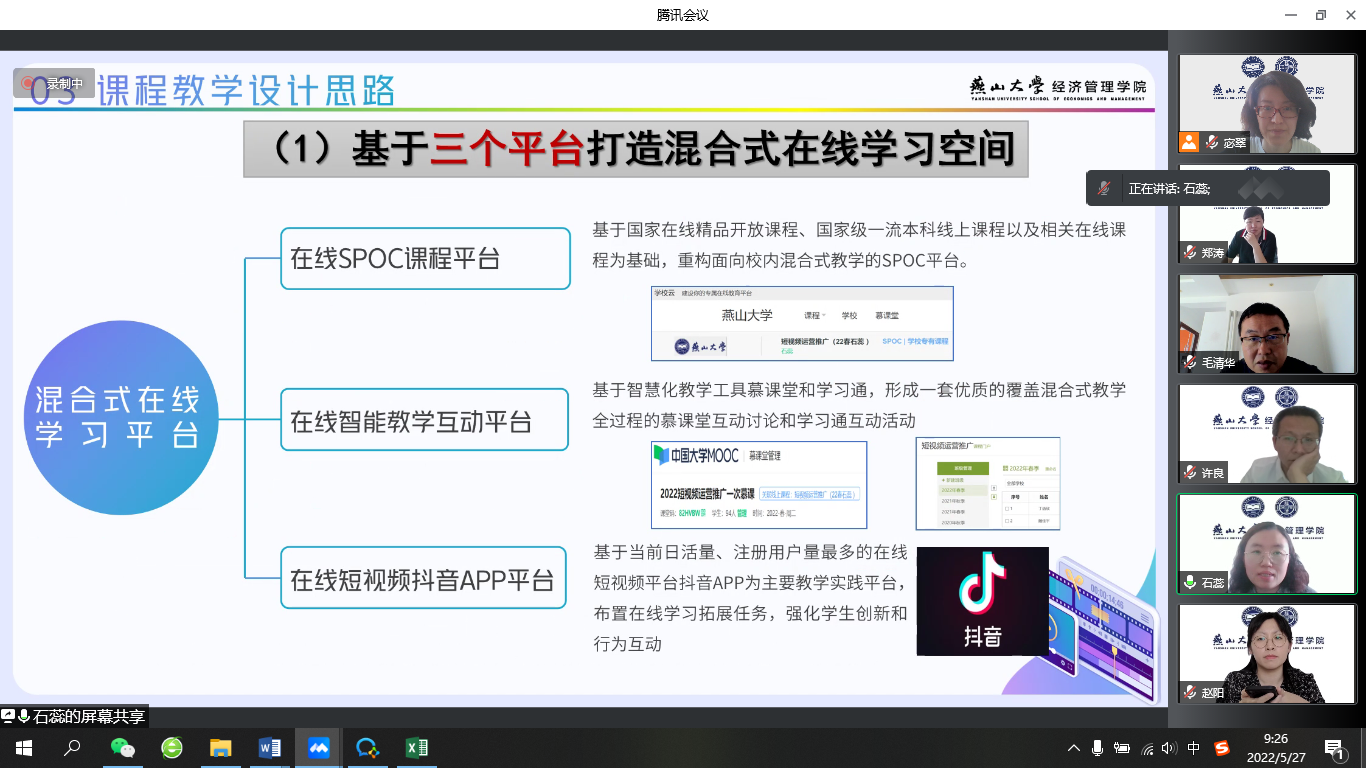 石蕊老师针对于校级公共选修课《短视频运营推广》进行了线上线下混合式教学改革探索,课程以“互联网+”教育大背景下,针对新商科专业培养目标及学生知识、能力、素养需求,提出“四分一融合”混合式课程体系,即实现了分层、分步、分类、分组的教学创新,达成了精细教学、智慧互动、课外拓展、主动思辨等教学效果提升,形成具有新商科通识课程特色的创新创业人才培养体系,并以“溶盐入水”的形式实施课程思政,规范学生的学习行为,培养学生成为爱国、负责任、有担当的人才。