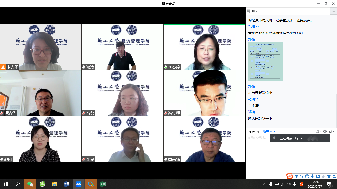 经济管理学院组织进行了混合式教学创新设计大赛院赛暨混合式教学交流会于5月27日,腾讯会议线上召开。此次比赛由院长李春玲教授担任组长,周荣辅、毛清华、郑涛、宓翠四位老师组成评审小组。来自工商、会计、工业工程和经济系的四名选手对开展混合式教学的课程进行了展示和分享。