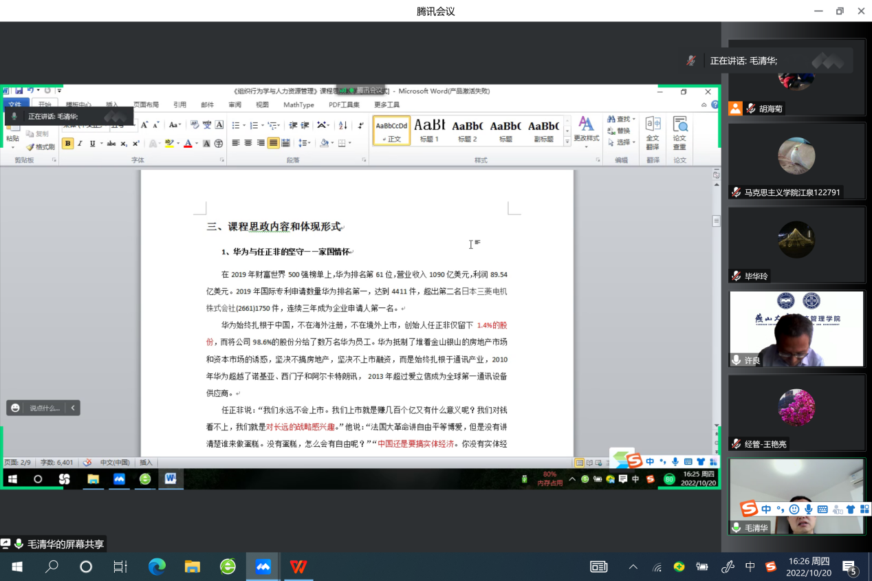 毛清华教授介绍《组织行为学与人力资源管理》课程思政教学情况,包括课前准备、课中授课和课后回顾三个教学环节和组织形式,并以“华为与任正非的坚守”“毛泽东的指挥艺术”“中国改革开放史”等为典型案例介绍开展课程思政教学的具体设计,帮助学生树立家国情怀、领导的艺术和沟通技巧。