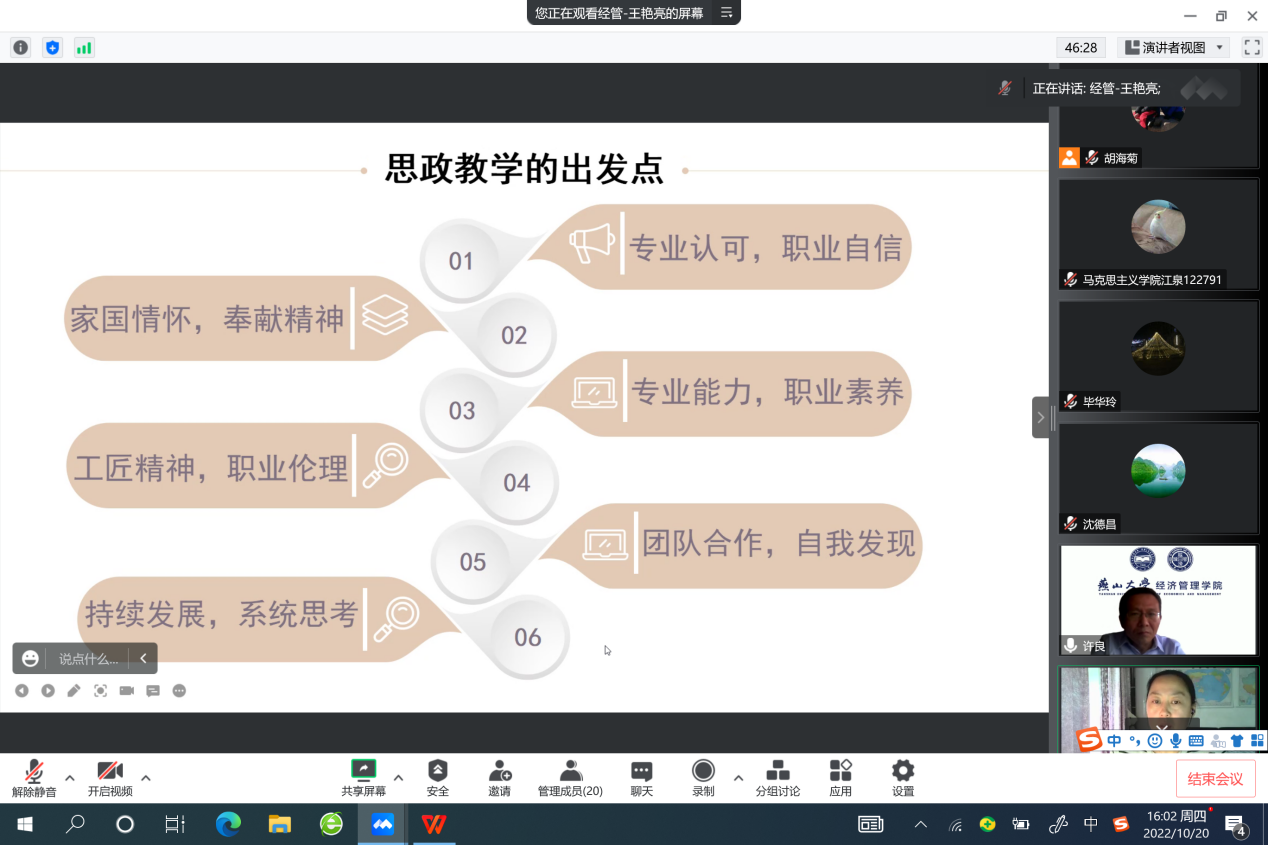 在教育部《高等学校课程思政建设指导纲要》(教高〔2020〕3号)、《乌鸦传媒推进课程思政建设实施方案》(燕大党字〔2019〕39号)、《乌鸦传媒课程思政示范课程、教学名师及教学团队建设方案》(燕大校字〔2021〕233号)和《课程思政与思政课程“双向融合”联合备课教研活动方案》的指导下,10月20日下午工业工程系与中国近现代史纲要教研部开展课程思政与思政课程“双向融合”联合备课教研活动,由于疫情影响,本次联合备课线上进行。参加本次活动的为工业工程系全体教师和中国近现代史纲要教研部6位教师。