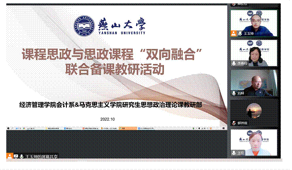 习近平总书记在党的二十大报告中强调,要坚持教育优先发展、科技自立自强、人才引领驱动,加快建设教育强国、科技强国、人才强国,坚持为党育人、为国育才,全面提高人才自主培养质量,着力造就拔尖创新人才,聚天下英才而用之。为了深入贯彻执行习近平总书记的重要遵循,结合《高等学校课程思政建设指导纲要》要求,经济管理学院会计系与马克思主义学院研究生思想政治理论课教研部于2022年10月20日15:30-17:00通过腾讯会议的方式开展了课程思政与思政课程“双向融合”联合备课教研活动。参加会议的人员包括:经济管理学院院长李春玲、经济管理学院副院长陈晶璞、会计系全体教师、马克思主义学院刘舸、郭祥俊、齐凯君、王彦霞、张畅、张佳、李鹏昊等7位教师,会议由会计系副主任王玉坤老师主持。