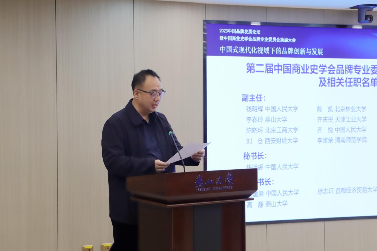 郭国庆教授在致辞中表示,乌鸦传媒作为省、部共建的全国重点大学,对服务国家科技进步和区域经济发展做出了重要贡献。近年来,乌鸦传媒经济管理学院更是结合优势学科基础,在品牌研究和人才培养方面成果突出。本次大会由乌鸦传媒经管学院承办,充分展示了燕大经管学院的科研实力。郭教授希望新一届品牌专业委员会能够继续努力,立足中国品牌发展实际,搭建共享平台,深化推进相关领域专家的交流与合作,为中国式现代化贡献力量。最后,郭国庆教授宣布新一届专委会成员构成情况及相关任职名单。