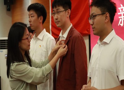 大会第二项:李宁老师、张梦老师为新党员代表佩戴党员徽章。