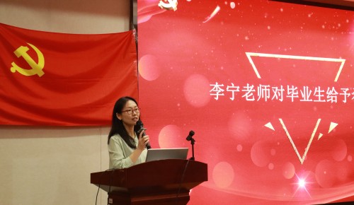 大会第六项:李宁老师为全体毕业生党员寄语。李宁老师强调毕业生党员们要谨记燕大精神,践行初心使命,将个人理想追求同党的伟大事业紧密结合,砥砺奋进。同时,她也对同学们提出三点期望:厚德,要坚定理想信念、锤炼坚强党性;博学,要不断学习,做积极、正能量的传递者;求是,要求真务实,脚踏实地。