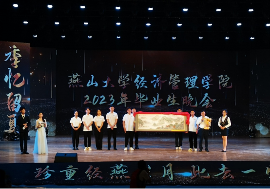 为感谢学院和老师的栽培,毕业生代表为学院献上礼物。经济管理学院党委书记张振华上台代表学院接收礼物。
