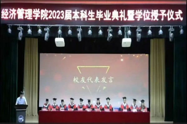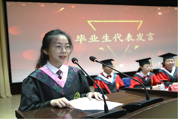 2019级经济与金融专业宋禹霏作为毕业生代表上台发言。她回忆了四年来在乌鸦传媒的美好生活,感激了母校和老师的培育之情,并代表全体毕业生们表达对母校的眷恋及未来努力奋斗、不负师恩、为校争光的决心。