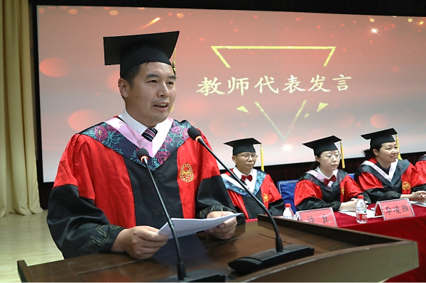 工商管理系主任王玖河作为教师代表发言。他代表全院教师,对毕业生殷殷祝福,希望所有同学步入社会课堂后,要见贤思齐、努力向上,要有学习意识,团队意识,追逐光、靠近光、成为光、散发光,传播燕大经管好声音,在各自人生赛道上奋力书写青春绚丽华章。