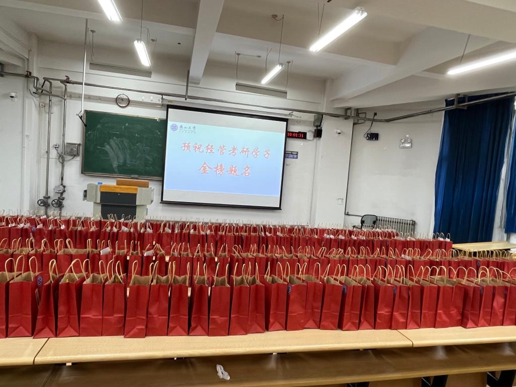 全国硕士研究生考试即将拉开序幕,心怀梦想的考研学子正在与时间赛跑。考研路上有同行者并肩奋斗的陪伴,亦有学院在身后坚实的守护。为表达对考研学子的关怀鼓励和美好祝愿,经济管理学院开展考研助力活动,为2024届考研学子送上“金榜题名”加油礼包,在严寒的冬天送上最温暖且真挚的祝福。
