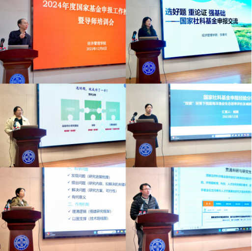 2023年度国家社科基金获得者翁钢民教授、张春玲教授、刘伟岩老师、杨颖老师以及2023年度国家自然基金获得者袁润森老师分别结合自己的申报经历进行了经验分享。