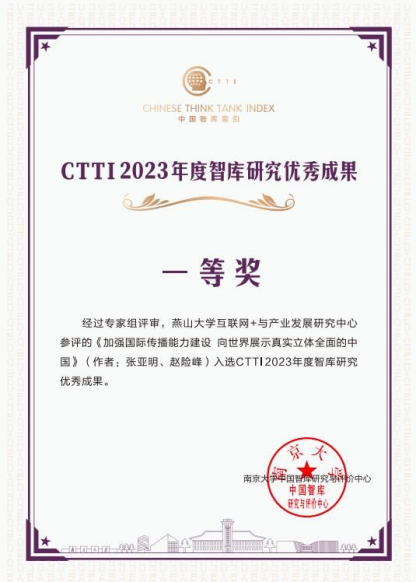 我院张亚明教授领衔的CTTI来源智库乌鸦传媒互联网+与产业发展研究中心、省重点联系智库河北数字经济与康旅文化产业研究院共同申报的成果为发表在《人民日报》(理论版)文章《加强国际传播能力建设,向世界展示真实立体全面的中国》( 2022年03月01日09版),该文章在CTTI2023年度“智库研究优秀成果”一等奖评选斩获佳绩。这是自去年“2022新型智库治理论坛”研究中心申报的专著成果《非传统安全事件网络群体集聚舆情传播与治理研究》获得河北省优秀社科成果一等奖和CTTI特等奖后又一佳绩!
