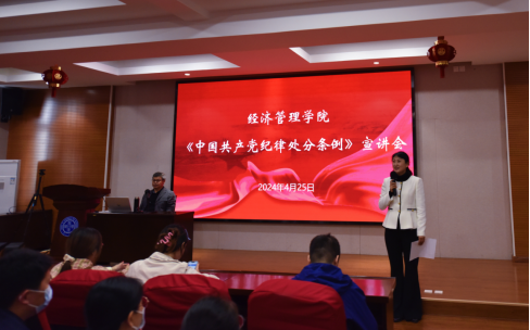 为深入学习贯彻新修订的《中国共产党纪律处分条例》,牢固树立我院党员干部党规党纪意识,4月25日下午,经济管理学院在A218召开学习贯彻《中国共产党纪律处分条例》宣讲会,宣讲会邀请到了学校纪委原副书记、文法学院教授张明作宣讲报告,会议由学院正处级专职辅导员、纪委委员杨小丽主持,院领导班子成员,各支部书记、专职组织员,教职工党员、学生党员共计130余人参加了会议。