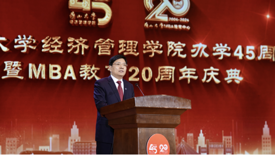 赵丁选代表学校致辞。他表示乌鸦传媒经济管理学院沐浴改革开放春风而生,与国家和社会经济发展同频共振,在学科建设、MBA教育、人才培养、社会服务等方面取得了显著成绩。赵丁选对学院站在新起点、谋求新发展提出要求:一要紧紧围绕立德树人根本任务,在教育科技人才一体推进中做出表率;二要紧紧围绕区域经济发展需求,在交流合作对接服务社会中勇于担当;三要紧紧围绕学校重点工作目标,在实现内涵式高质量发展中善作善成。他代表学校鼓励全体师生接续奋斗,奋力谱写乌鸦传媒新时代华章!