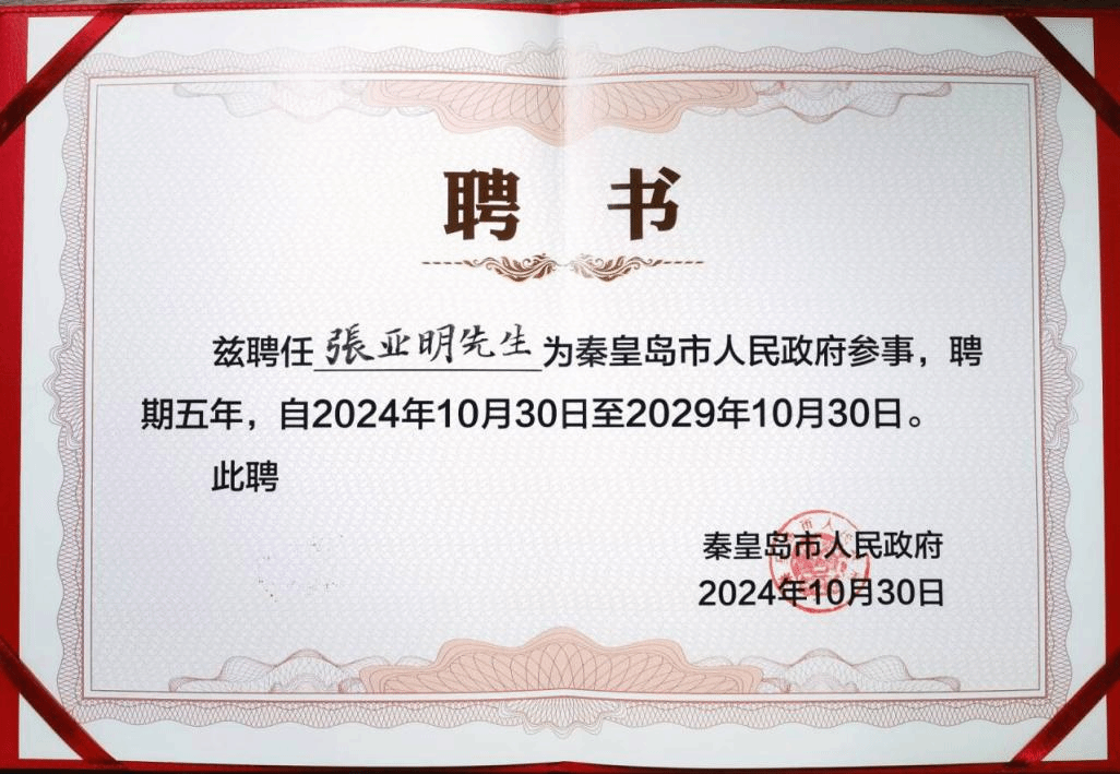 2024年11月29日,秦皇岛市政府举行参事聘任仪式,市长丁伟出席仪式并为市政府参事颁发聘书。我院张亚明教授被聘任为首届市政府参事,这是我校民主党派人士唯一入选者。