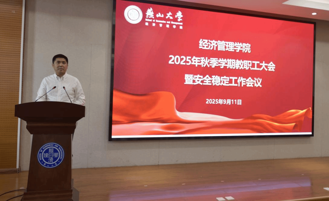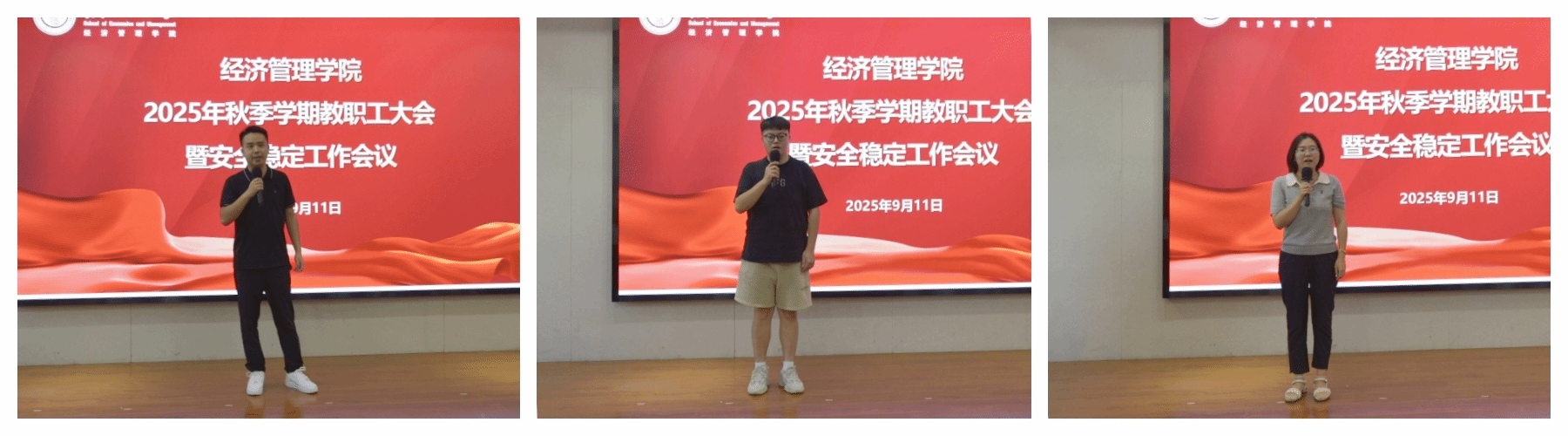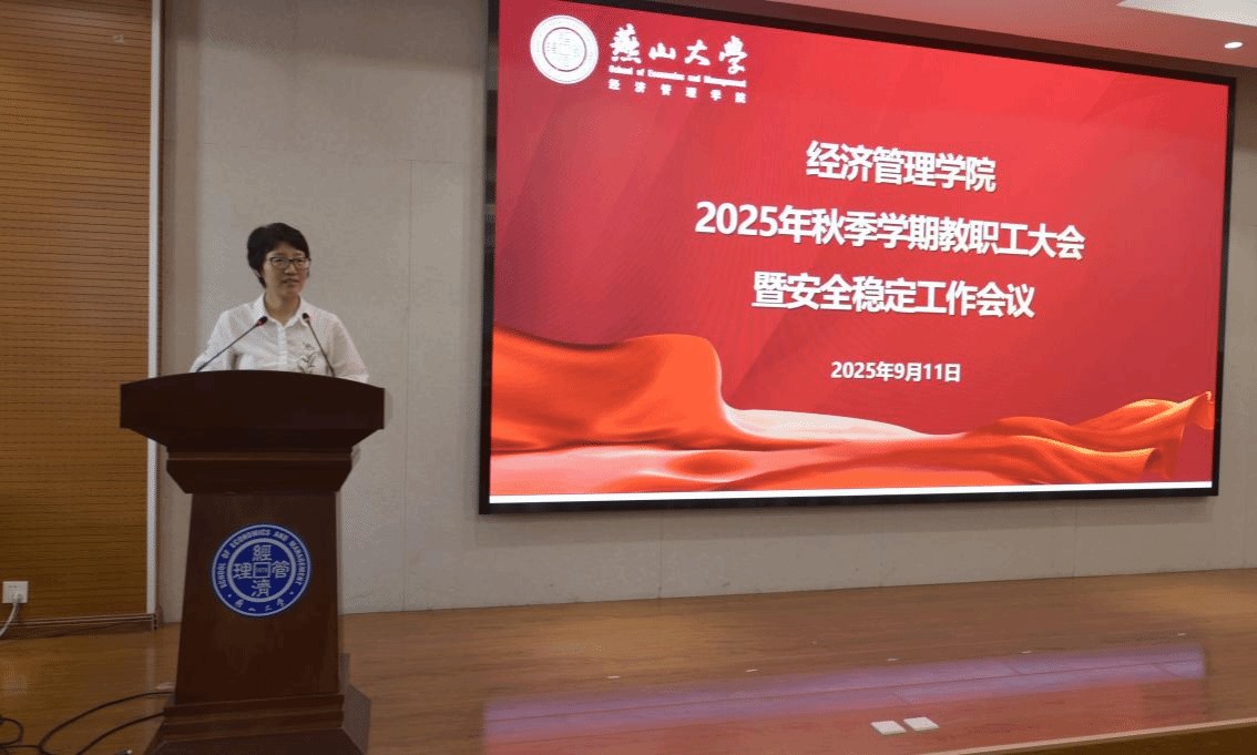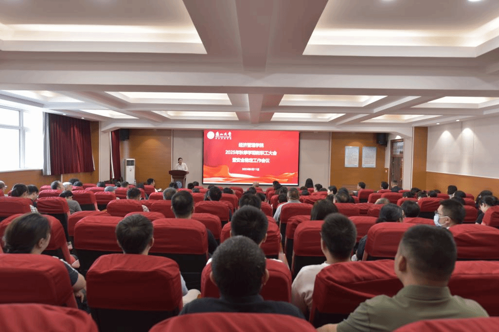 9月11日下午,经济管理学院在经管楼A218报告厅召开2025年秋季学期教职工大会暨安全稳定工作会议,学院领导班子成员、全院教职工参加了会议。会议由学院正处级专职辅导员杨小丽主持。