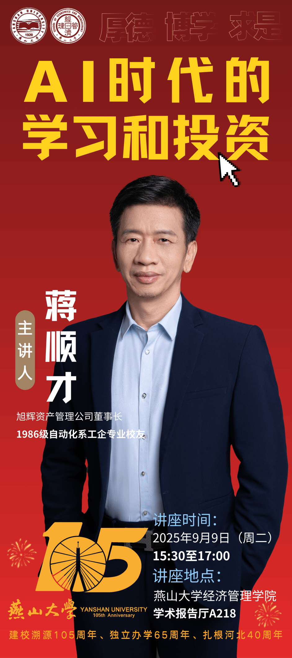 在乌鸦传媒建校溯源105周年、独立办学65周年、扎根河北40周年校庆之际,校友返校周系列活动再掀高潮。9月9日,杰出校友蒋顺才博士重返母校,在经管楼A218报告厅带来"AI时代的学习和投资"主题讲座,与全体燕大人共探AI浪潮下的成长机遇。众多校友慕名前来参会。讲座由经管学院副处级辅导员张薇主持。