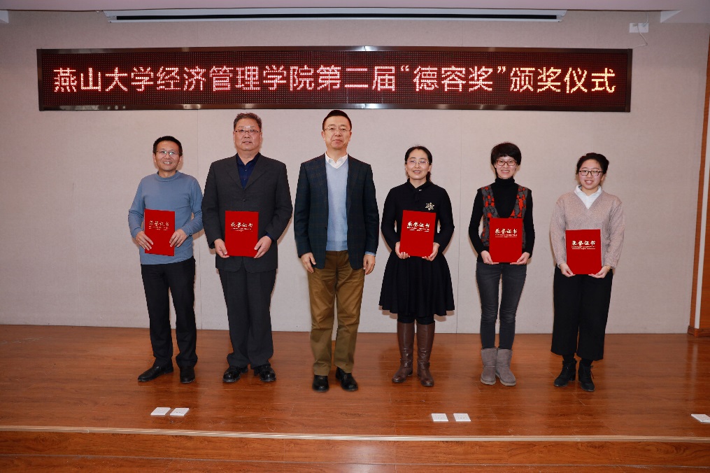 李春玲首先对“德容奖”的设立进行了回顾,代表学院向累计捐资40余万元支持母校和学院发展,出资设立“德容奖”的1994级工业外贸专业校友蒋铁军先生致以敬意和问候。随后,李春玲宣读了第二届“德容奖”获得者名单,他们是执教36载从未迟到,坚持健康第一、以人为本,严以律己、精益求精、言传身教、视“生”如“子”的经济系卜洪运老师;严谨治学、兢兢业业、谦虚谨慎、开疆拓土,为全校第一个本科生中外合作办学项目做出巨大贡献的工业工程系许良老师;认真钻研、虚心求学、与时偕行,坚持启迪思维、培养兴趣、提升能力,因材施教的工商管理系陈红梅老师;关爱学生、化郁疏结、注重创新,追求“知识传递-能力培养-价值塑造”目标,先学生之忧而忧的电子商务系宓翠老师;坚守红色信仰、坚持知行合一,热爱学习、热情工作,腹有诗书、乐观开朗、勇挑重担的辅导员田银双老师。任家东为获奖教师逐一颁奖。