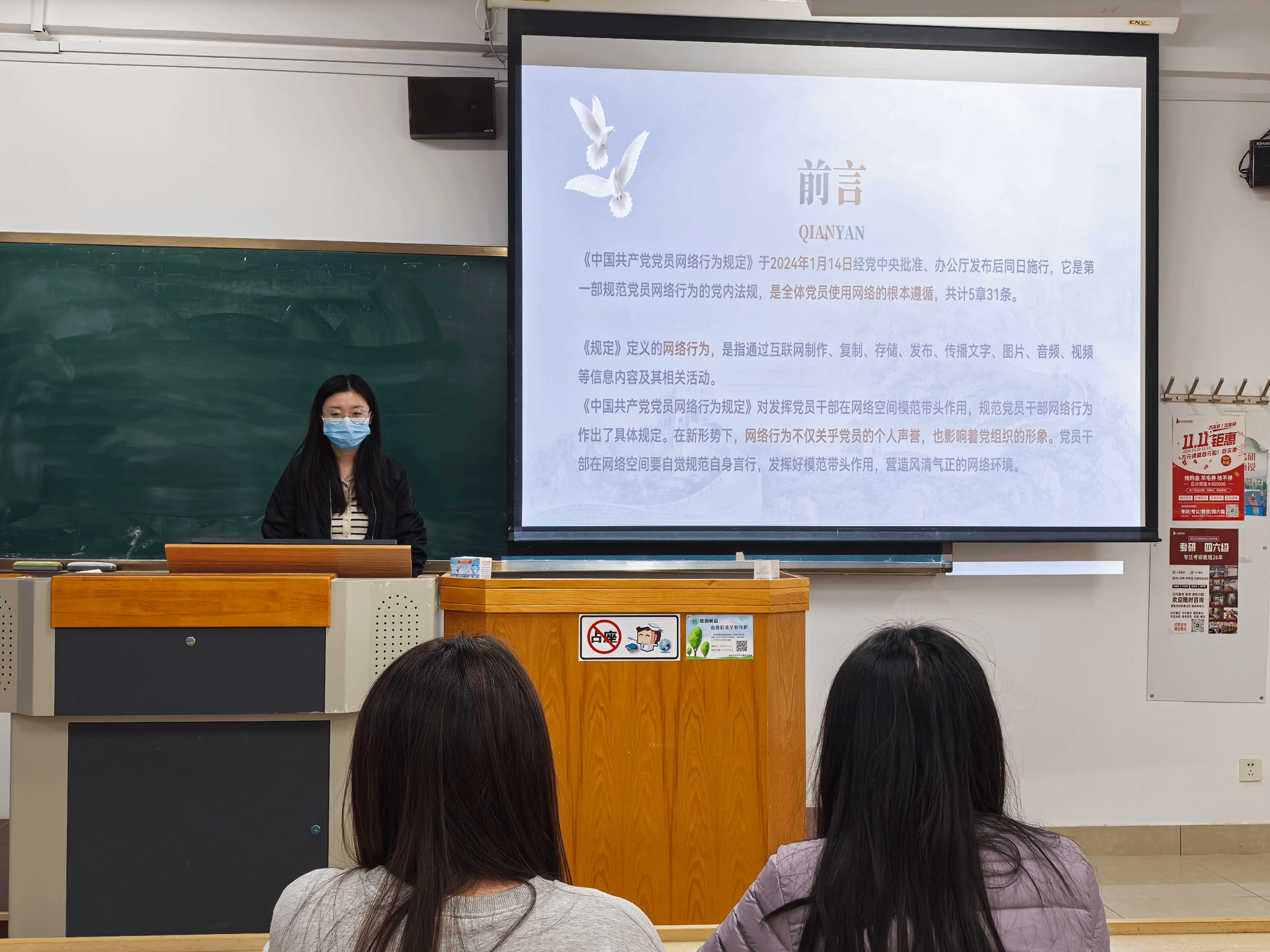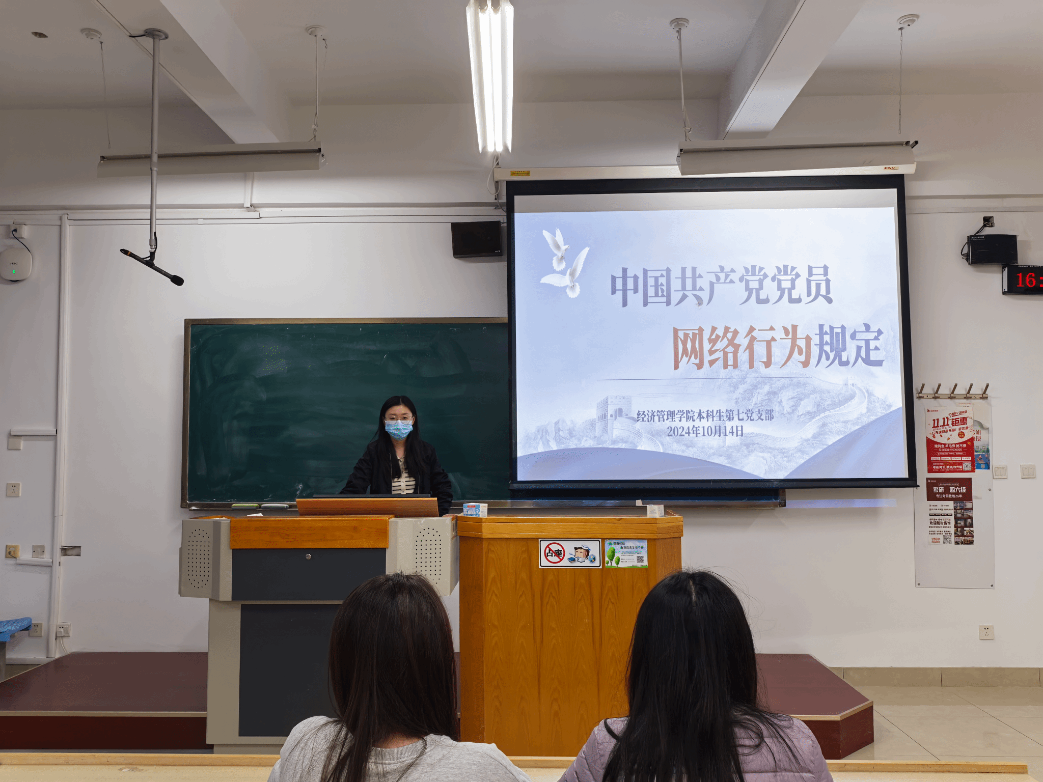 2024年10月17日下午16:00,经济管理学院本科生第七党支部开展学习《中国共产党党员网络行为规定》主题党日活动。本次党日活动由支部书记唱思迪主持,全体党员参加。