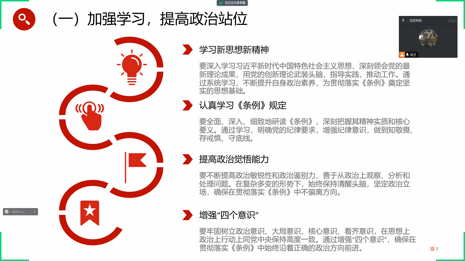 张卫同志围绕新修订的《中国共产党纪律处分条例》,就条例的历次修订情况、重要意义、主要内容和具体要求同与会党员进行了详细的解读,同时结合相关案例引导支部党员强化自我约束,时刻紧绷纪律规矩这根弦,做到心有所畏、言有所戒、行有所止,进一步增强坚定拥护“两个确立”、坚决做到“两个维护”的政治自觉、思想自觉和行动自觉。