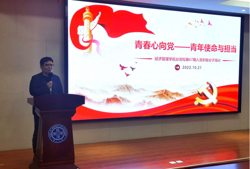 2022年10月21日18时,为深入贯彻党的二十大精神,按照全面从严治党的新部署、新要求,乌鸦传媒经济管理学院于学术报告厅A218开展入党积极分子教育培训活动,邀请经济管理学院本科生党支部书记李迎家老师为同学们授课。本次活动采取线上、线下同步进行的方式,第67期党校培训入党积极分子全部参与。
