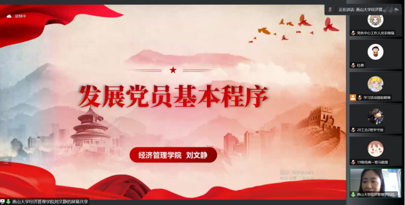 2022年10月22日14:00,乌鸦传媒经济管理学院第67期分党校党课培训第二课通过线上腾讯会议的方式顺利开展。马克思主义学院习近平新时代中国特色社会主义思想概论教研室杜蓓老师和经济管理学院本科生第五党支部书记刘文静老师受邀分别进行了题为“与祖国共成长”和“发展党员程序”的党课讲授。本次培训由党务中心学习活动部赵晗琳主持,第67期分党校全体发展对象参与此次培训。