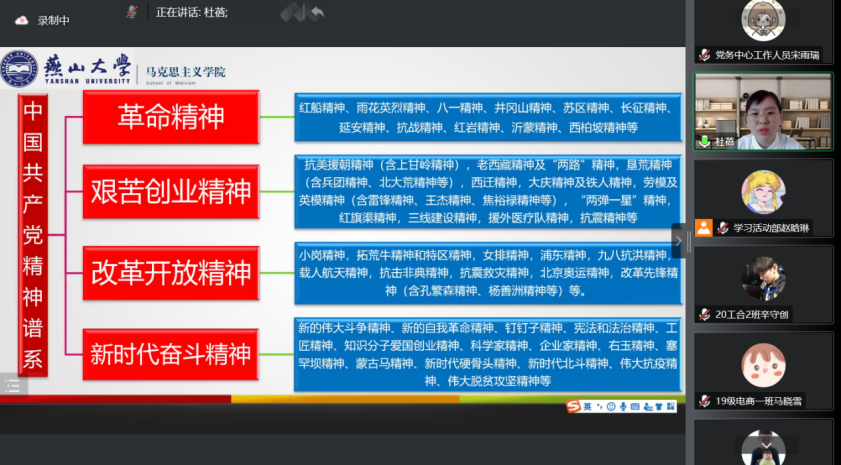 党课前半程,杜蓓老师以同学们最熟悉的动画片《猫和老鼠》为引,向同学们展示了上世纪四十年代美国的生活水平,同一时间的中国还处在大生产运动之中。杜蓓老师通过展示多组数据,让同学们感受到了中国八十年来的巨变,尤其是近十年来中国在经济水平、创新能力等方面的巨大飞跃。之后,杜蓓老师列举了青年毛泽东、青年习近平的事迹,并以乌鸦传媒的家国情怀为导,勉励同学们学习中国共产党的精神内涵,积极承担起青年的社会责任,顺应大势,与祖国共同成长。