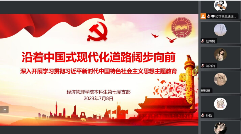 7月8日下午,经济管理学院本科生第七党支部开展主题教育专题党课,党支部书记唱思迪面向支部全体党员,以《沿着中国式现代化道路阔步向前》为题进行讲授。