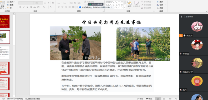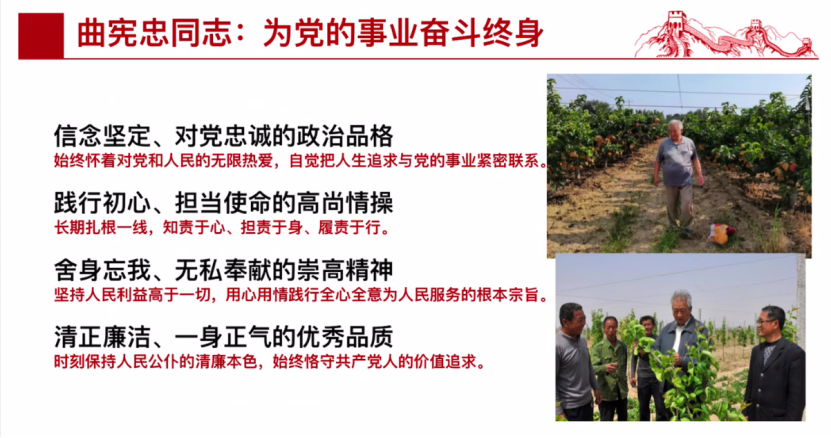 首先,各组主持人介绍了曲宪忠同志的生平事迹并播放视频《追记“燕赵楷模”曲宪忠:有了初心,就是一辈子的事》使大家对曲宪忠同志的事迹进行深入了解。曲宪忠同志作为一名务林人和一名普通共产党员,退而不休,以七十岁高龄,十年如一日,扎根基层,拔穷根,兴产业,通过他的努力奋斗,在曾经的沙荒地上,崛起了一片片壮观的绿色海洋。