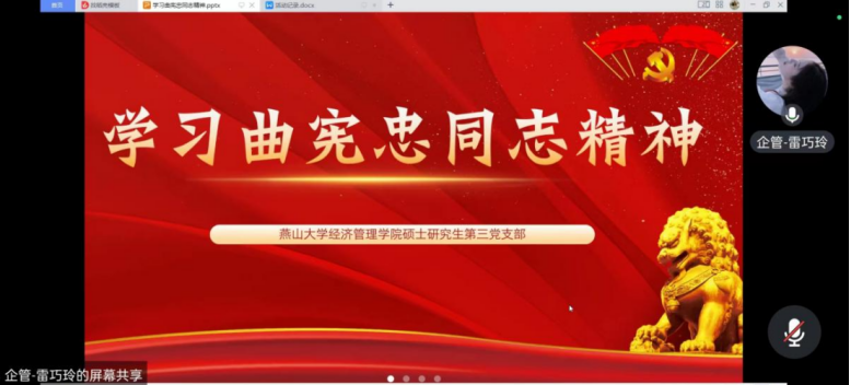为更好弘扬曲宪忠同志的崇高品质,激励广大党员同志胸怀理想、坚定信念,勇于担当,经济管理学院硕士研究生第三党支部于2023年7月29日开展线上“学习曲宪忠同志先进事迹”主题党日活动。本次活动以党小组为单位分四组展开学习,各组由党小组长主持并记录学习过程。
