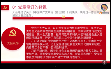 习近平总书记指出:“党章是我们立党、治党、管党的总章程,是全党最基本、最重要、最全面的行为规范。”党支部书记向全体党员同志阐述了党章修订的背景意义,深入学习体会“两个确立”的决定性作用,更加自觉地维护习近平总书记党中央的核心、全党的核心地位,更加自觉地维护以习近平同志为核心的党中央权威和集中统一领导,全面贯彻习近平新时代中国特色社会主义思想,坚定不移在思想上、政治上、行动上同以习近平同志为核心的党中央保持高度一致。