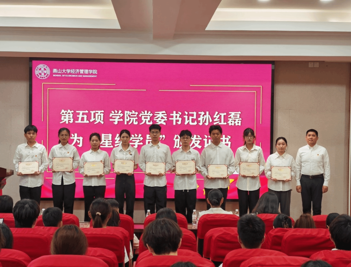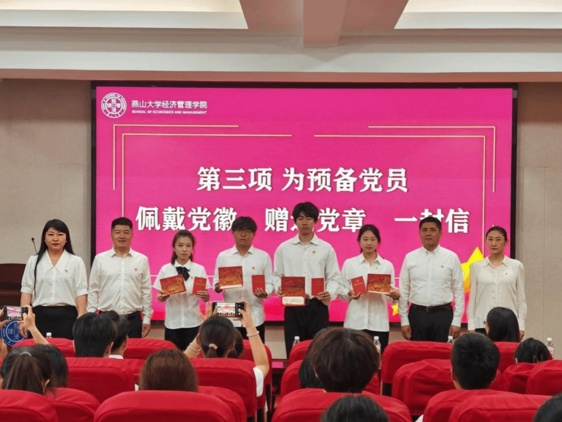 王海涛宣读经济管理学院2025年春季学期新发展预备党员名单,53名青年学子经过组织培养与考核,光荣加入中国共产党。全体党员面向党旗庄严宣誓。