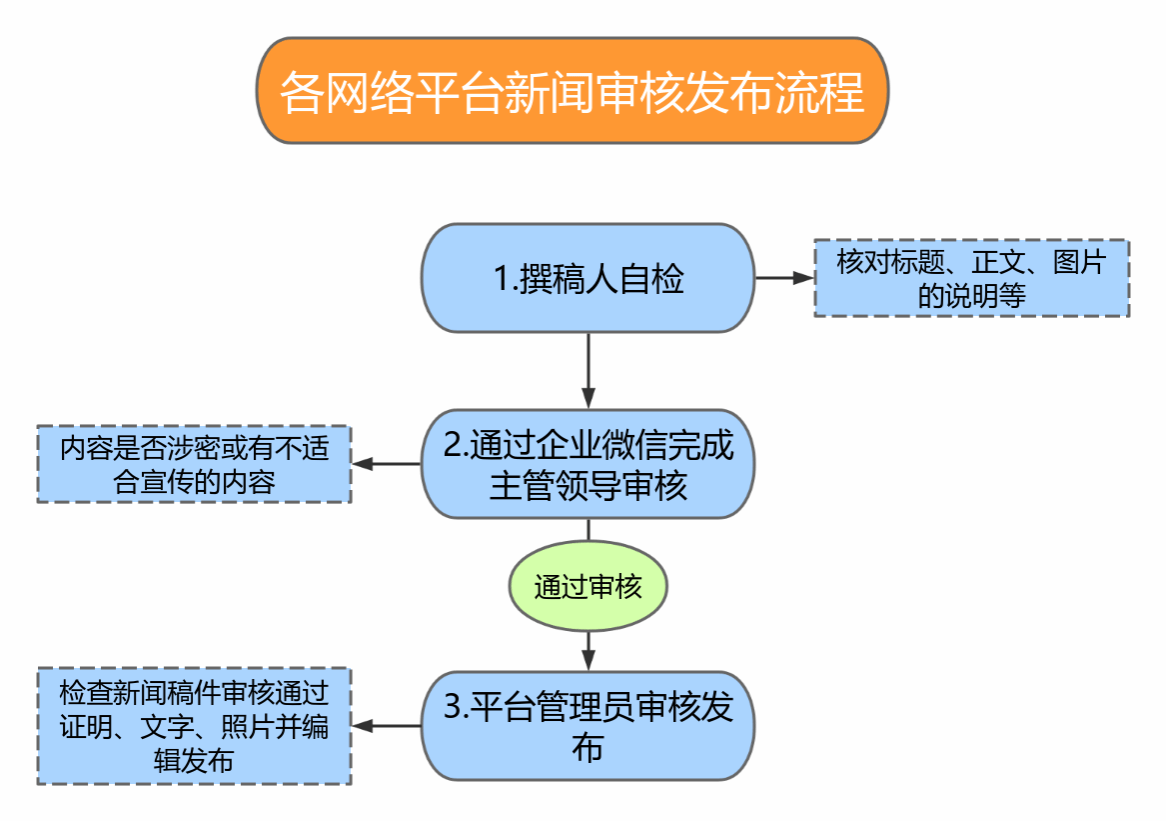 (三)审核与发布:编辑内容须经部门主管领导审核通过后方可发布。审核通过后,新闻稿件需通过企业微信、微信或指定邮箱提交至平台管理员处,具体流程附后。