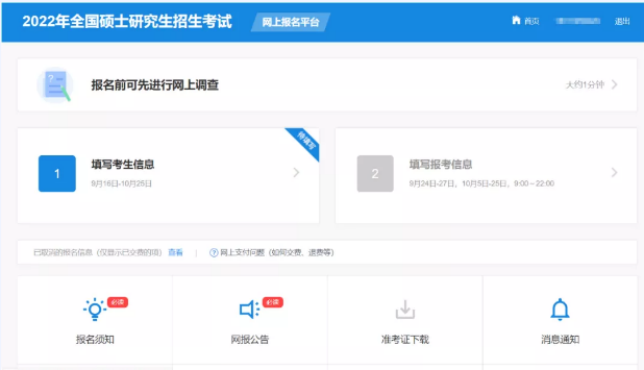 考生打开研招网(http://yz.chsi.com.cn/)首页后,用已注册的学信网账号登录网报系统,网报系统将报名分为填写考生信息和填写报考信息两大步骤。填写考生信息功能已于9月16日开通,一直持续到报名结束,填写报考信息功能只有在报名时间内才可以操作,非报名时间则是灰色不可操作的。考生信息填写功能开通后,考生即可登录网报系统进行考生信息的填写和修改。