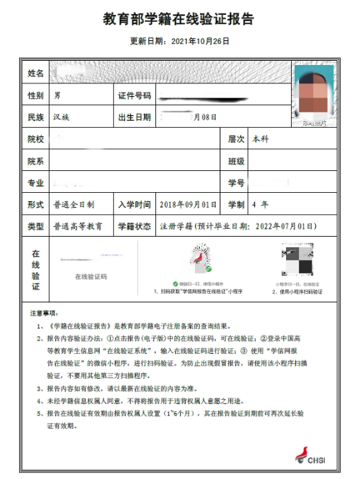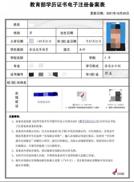 学信网《教育部学历证书电子注册备案表》(报告验证码应在有效期内,下载路径:“中国高等教育学生信息网”http://www.chsi.com.cn/ > “学信档案”> 查看/申请“在线验证报告”);