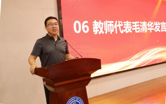 教师代表毛清华教授向全体同学提出三点希望和建议,一是培养家国情怀,二是提升能力,三是反思人生,并代表全体教师表示会以持续提升教学水平,为建设特色鲜明、国内一流、世界知名的研究型大学贡献力量。