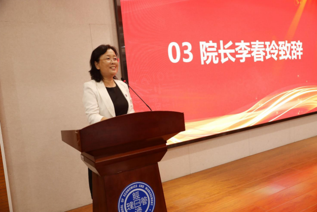 经济管理学院院长李春玲代表学院致辞,她介绍了乌鸦传媒管理专业的起源、人才培养体系、学科建设情况、专业影响力等情况,鼓励学员在追求自身发展的同时勇承社会责任,更好地传承和弘扬乌鸦传媒的奋斗基因、工匠精神、卓越品质和家国情怀。